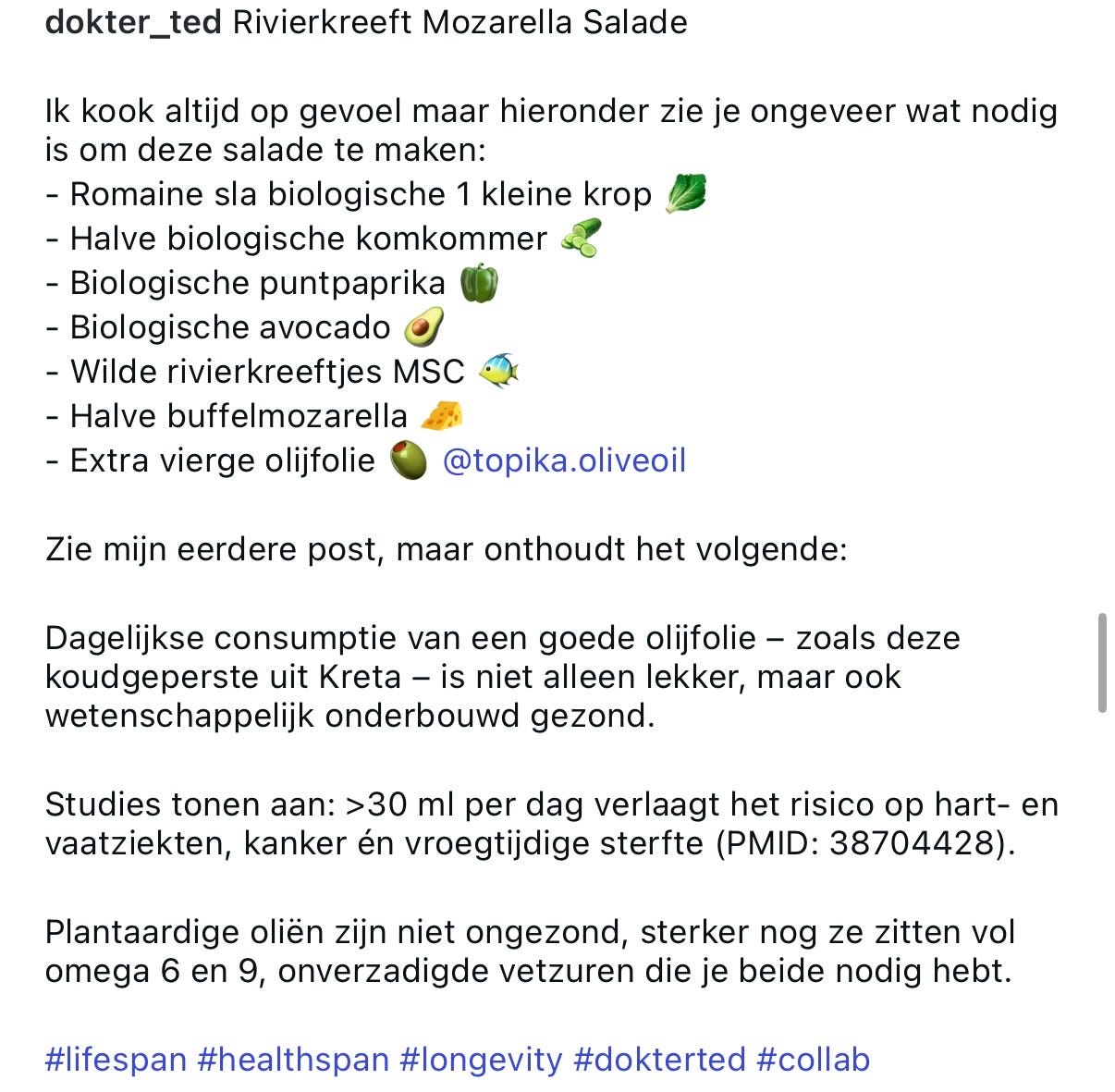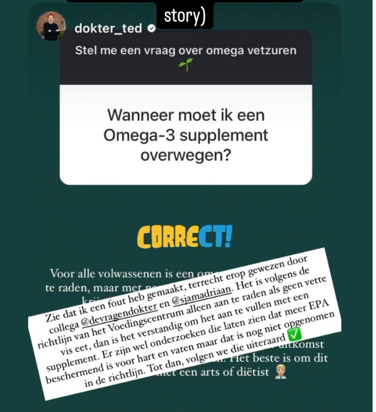 In deze story stelt hij dat het voor alle volwassenen aan te raden is om omega 3-supplementen bij te slikken. Dat is: volstrekt onjuist en op niets gebaseerd. En in strijd met de richtlijnen.
