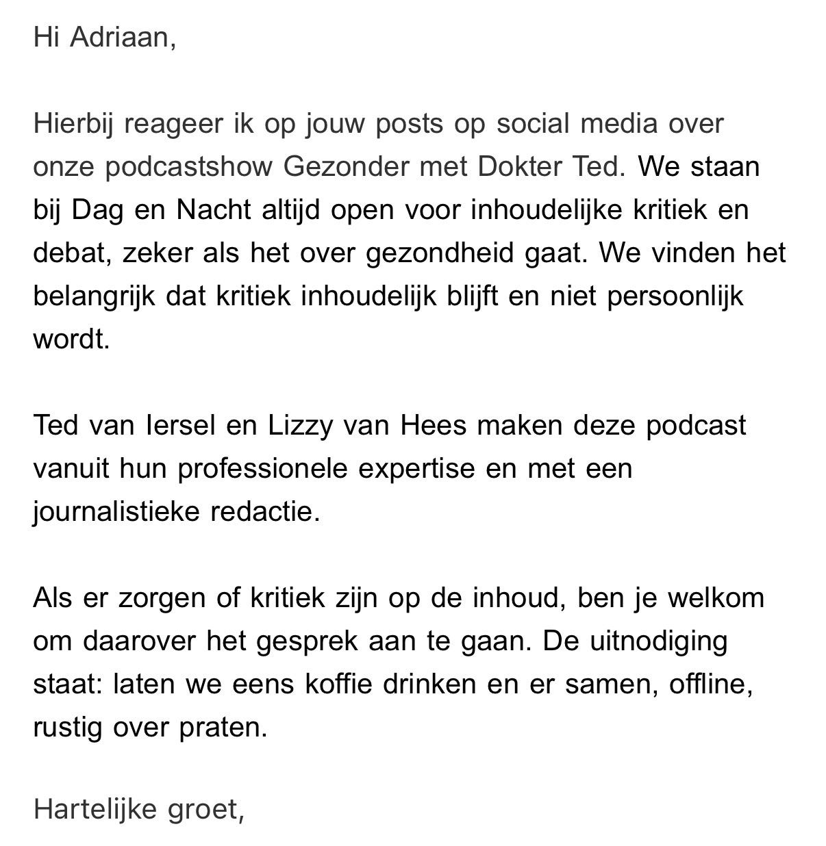 Ted reageert al meer dan een jaar niet op mijn vragen om bronnen en heeft me bij vraag om wederhoor op dit stuk geblokkeerd. Lizzy van Hees heeft me na kritiek op bovenstaand fragment ook geblokkeerd op Instagram. Maar nu krijg ik de baas van een mediabedrijf op mijn dak en moet ík komen opdraven om lekker gemoedelijk een kopje koffie te komen drinken, terwijl ik de dingen die hierboven staan heb aangekaart in wat Instagramstories. Die zijn dus gewoon inhoudelijk, zij het met een bijtende toon. Hun podcast is daarbij juist zelf inhoudelijk ronduit incorrect en niet zelden toondoof. Ja, laten we het dus vooral bij de inhoud houden.
