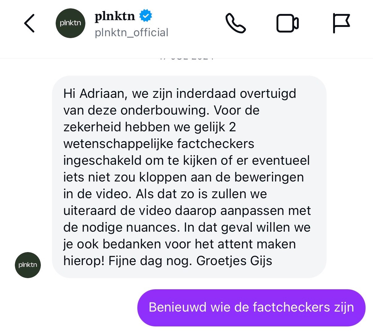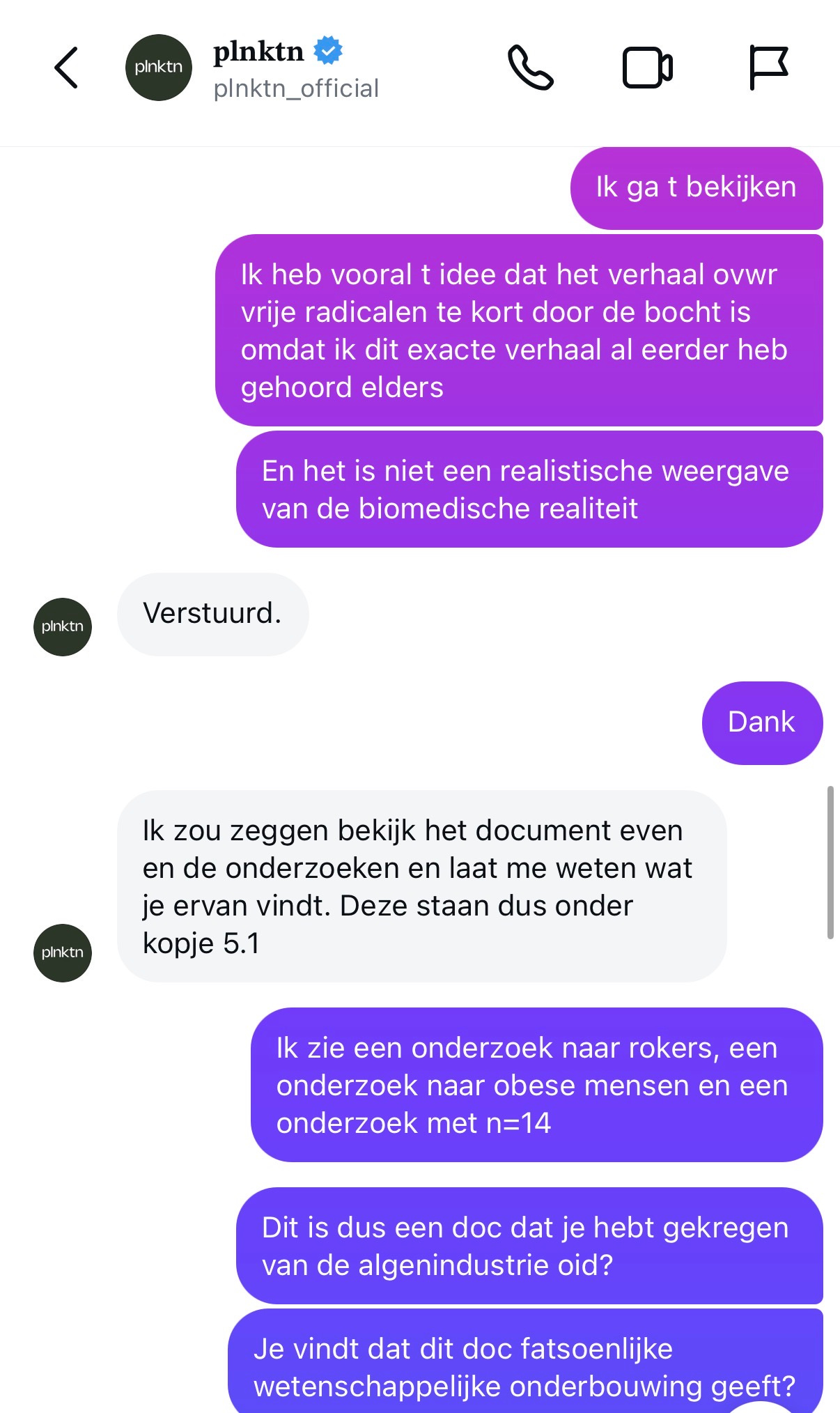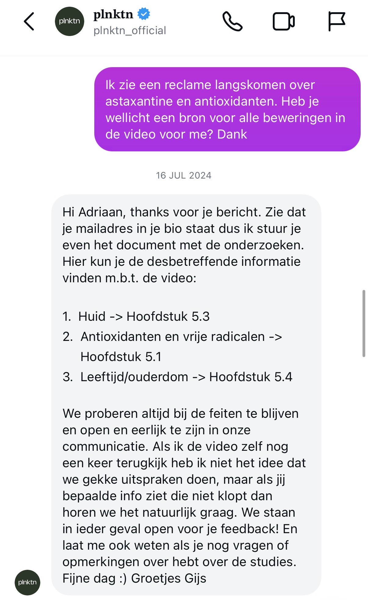 Nu we het toch over plnktn hebben: niet veel later zag ik een nogal opmerkelijke reclame langskomen, waar ik ze ook een paar vragen over stelde. Als onderbouwing kreeg ik een algemeen pdfje waar een paar onderzoeken in stonden, zonder specifieke onderbouwing. Het was alsof een moederbedrijf deze had verstrekt. En dus ook geen goede onderbouwing.