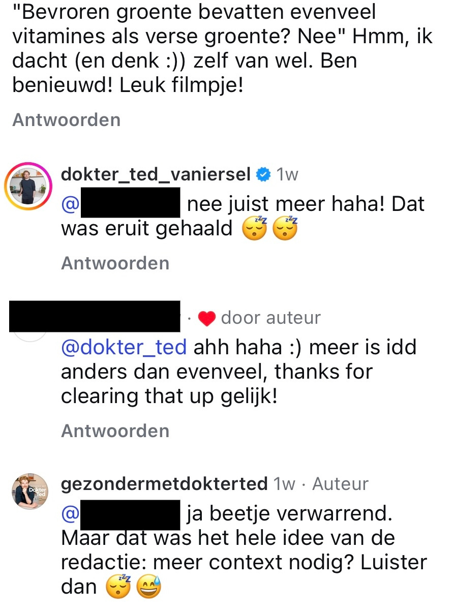 Ted weet dus heel goed dat er in bevroren groente evenveel of zelfs meer zitten dan verse groenten. Dat zei hij ook. Maar de redactie heeft er voor gekozen om dit te laten weg te knippen om de luisteraar te prikkelen. En hij is daar als arts mee akkoord gegaan.