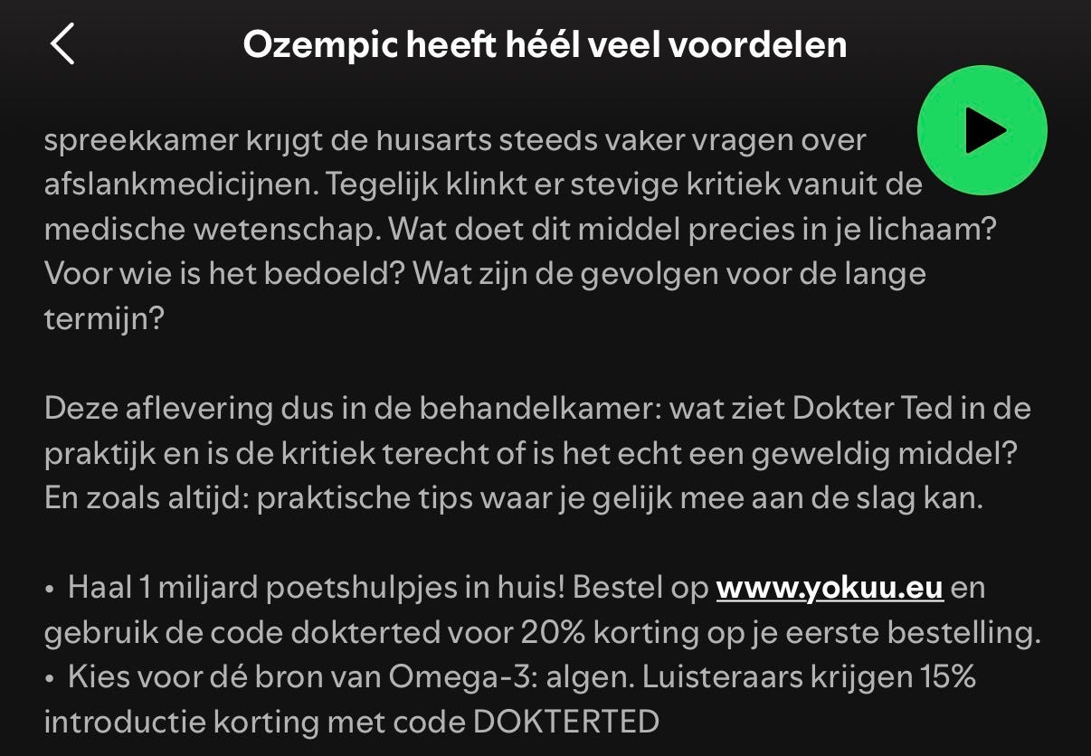 Overigens is Ted in deze podcast zorgwekkend lyrisch over Ozempic en noemt hij structureel de merknaam Ozempic en niet de werkzame stof semaglutide of op zijn minst afslankmedicatie.