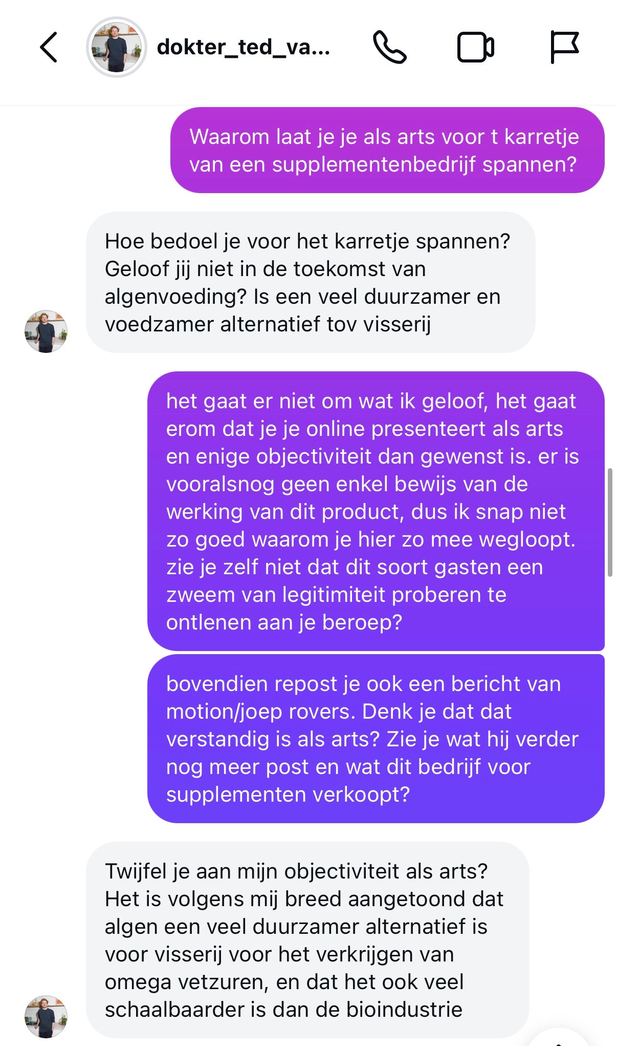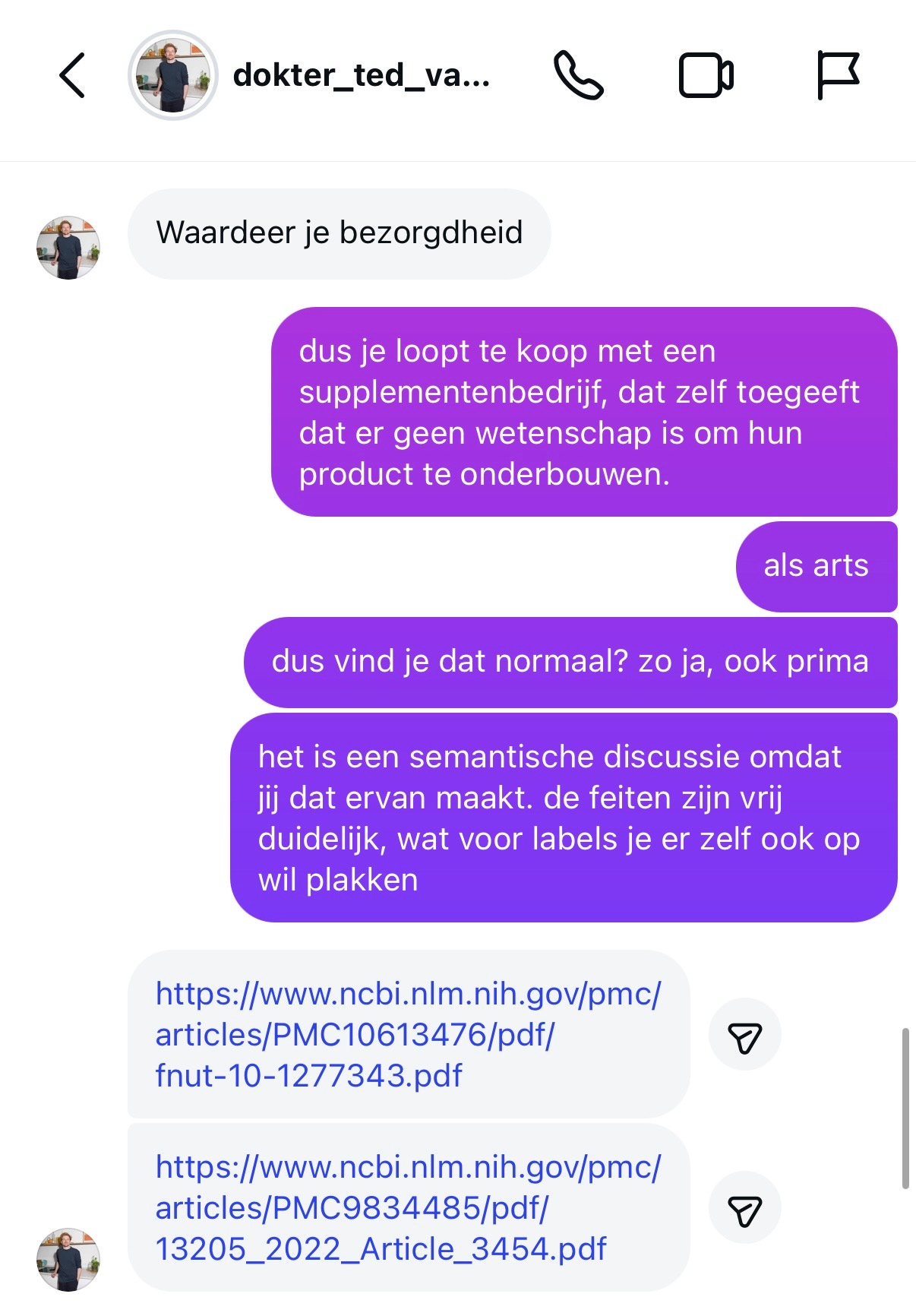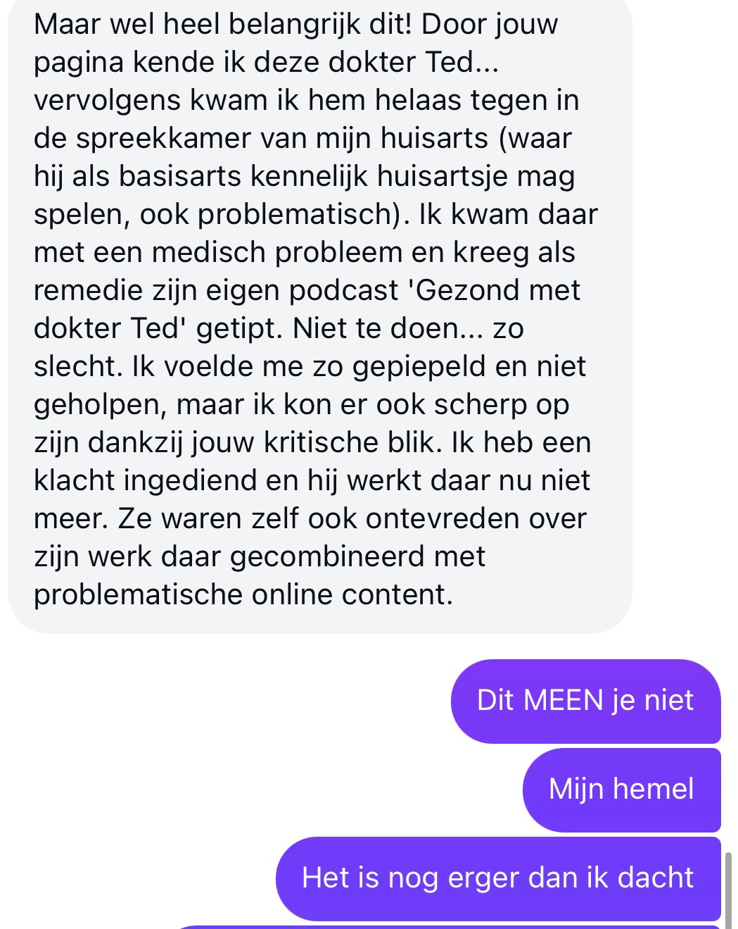 Eigenlijk wist ik hier al wat voor vlees ik in de kuip had. Het erge is nog wel dat ik mezelf in deze heb mee laten nemen in een discussie over de werking van de supplementen, terwijl dat irrelevant is: je hoort als arts gewoon onafhankelijk te zijn. En dat is Ted niet.