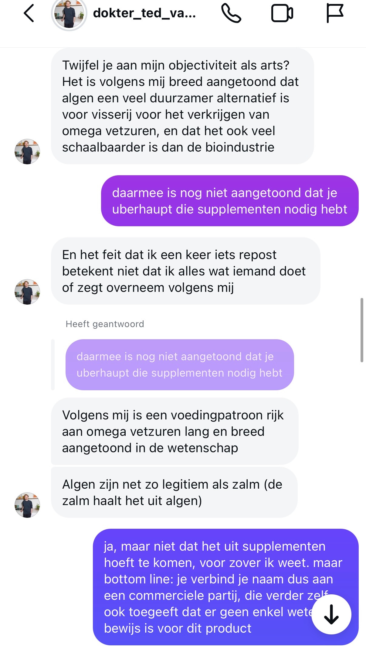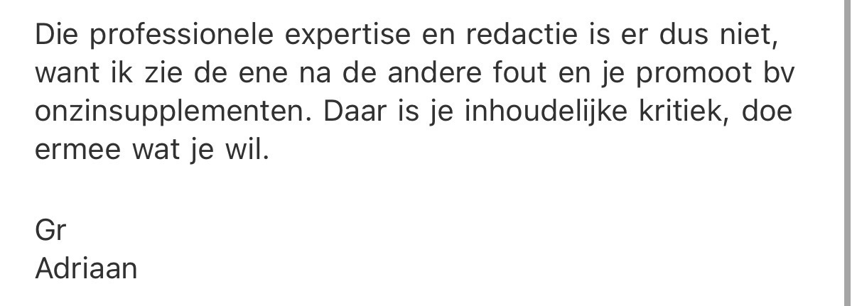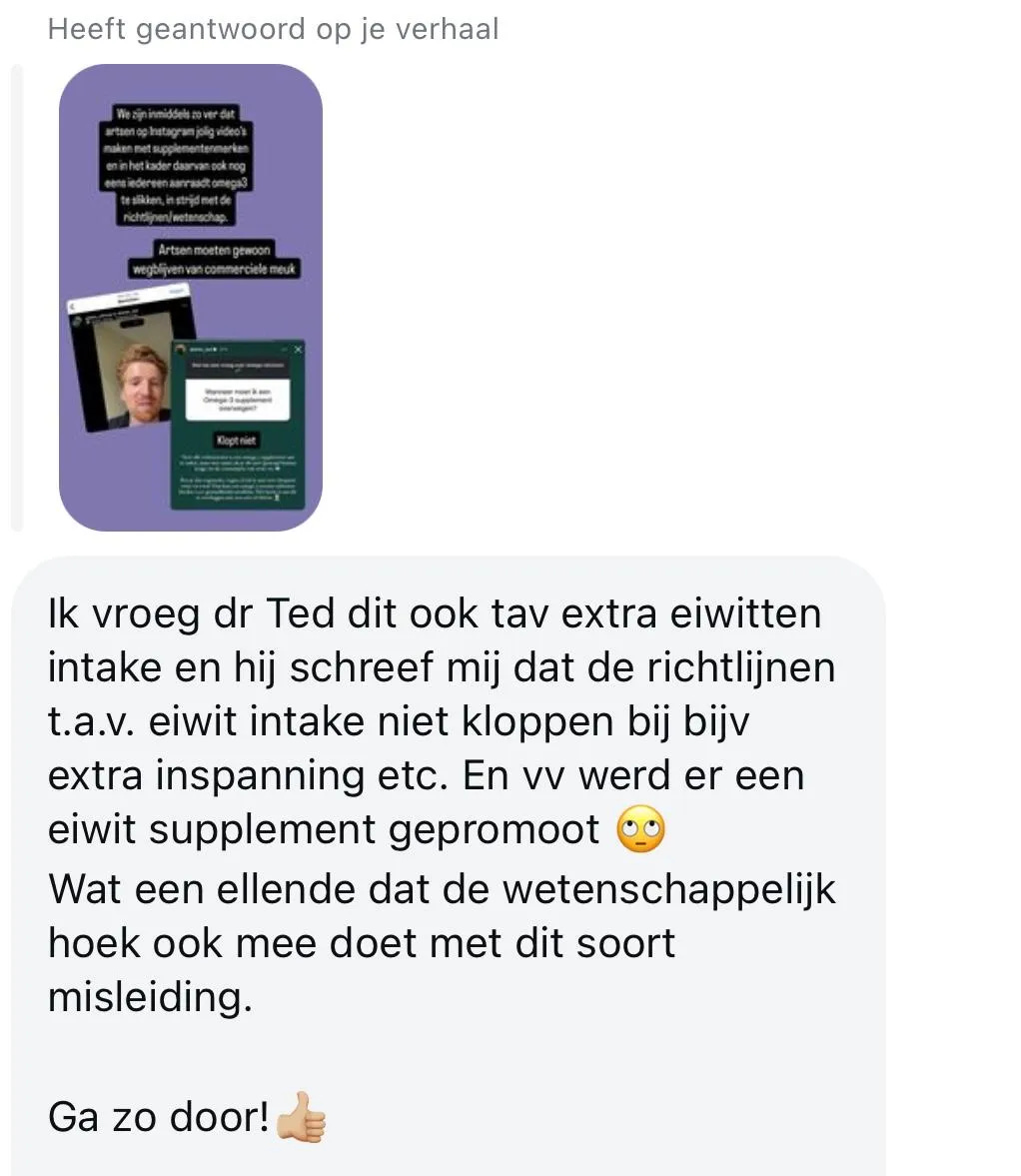 Eigenlijk wist ik hier al wat voor vlees ik in de kuip had. Het erge is nog wel dat ik mezelf in deze heb mee laten nemen in een discussie over de werking van de supplementen, terwijl dat irrelevant is: je hoort als arts gewoon onafhankelijk te zijn. En dat is Ted niet.