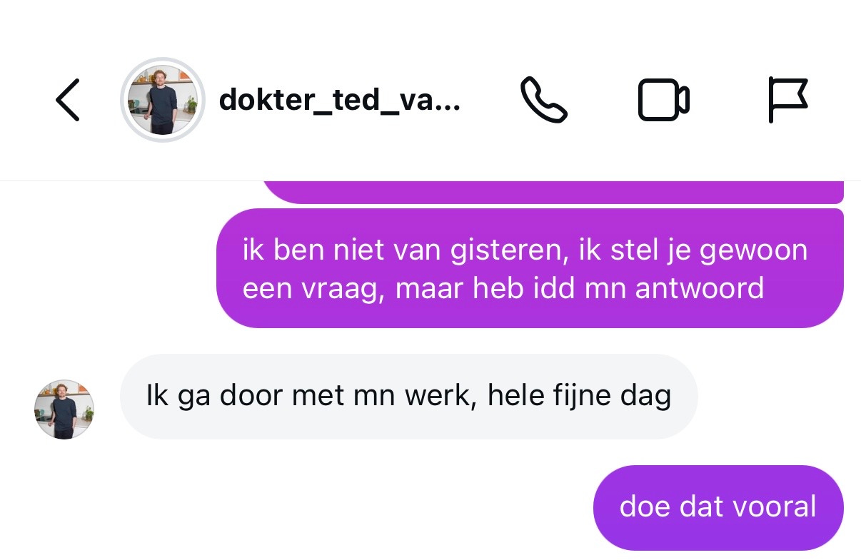 Op moment van schrijven heeft hij zo’n 40.000 volgers op Instagram bij elkaar gecharlatand, and counting. Hij heeft daarbij met z’n slangenolie-strapatsen vaste columns gescoord bij Women’s Health en Metro én een eigen podcast bij Dag en Nacht Media, genaamd Gezonder met Dokter Ted. Niet geheel onbegrijpelijk, want een arts wordt toch nog altijd als betrouwbaar beschouwd. En terecht, overigens, alleen maakt Ted op monumentale manier misbruik van dit vertrouwen.