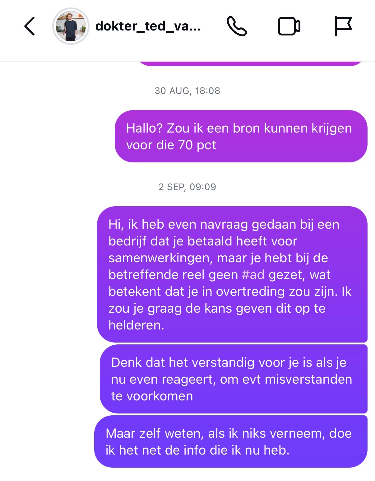 Bovenstaande streken zijn voor mij al schrijnend genoeg om er flink wat kabaal over te maken. Een poos geleden gebeurde er echter iets waardoor dit alles voor mij in een nóg negatiever daglicht is komen te staan. Ik zag Ted namelijk allerlei merken aanprijzen in zijn berichten, van supplementen tot behandelingen, van kleding tot kookgerei. Maar nooit met de vermelding dat het een advertentie is. Nooit.