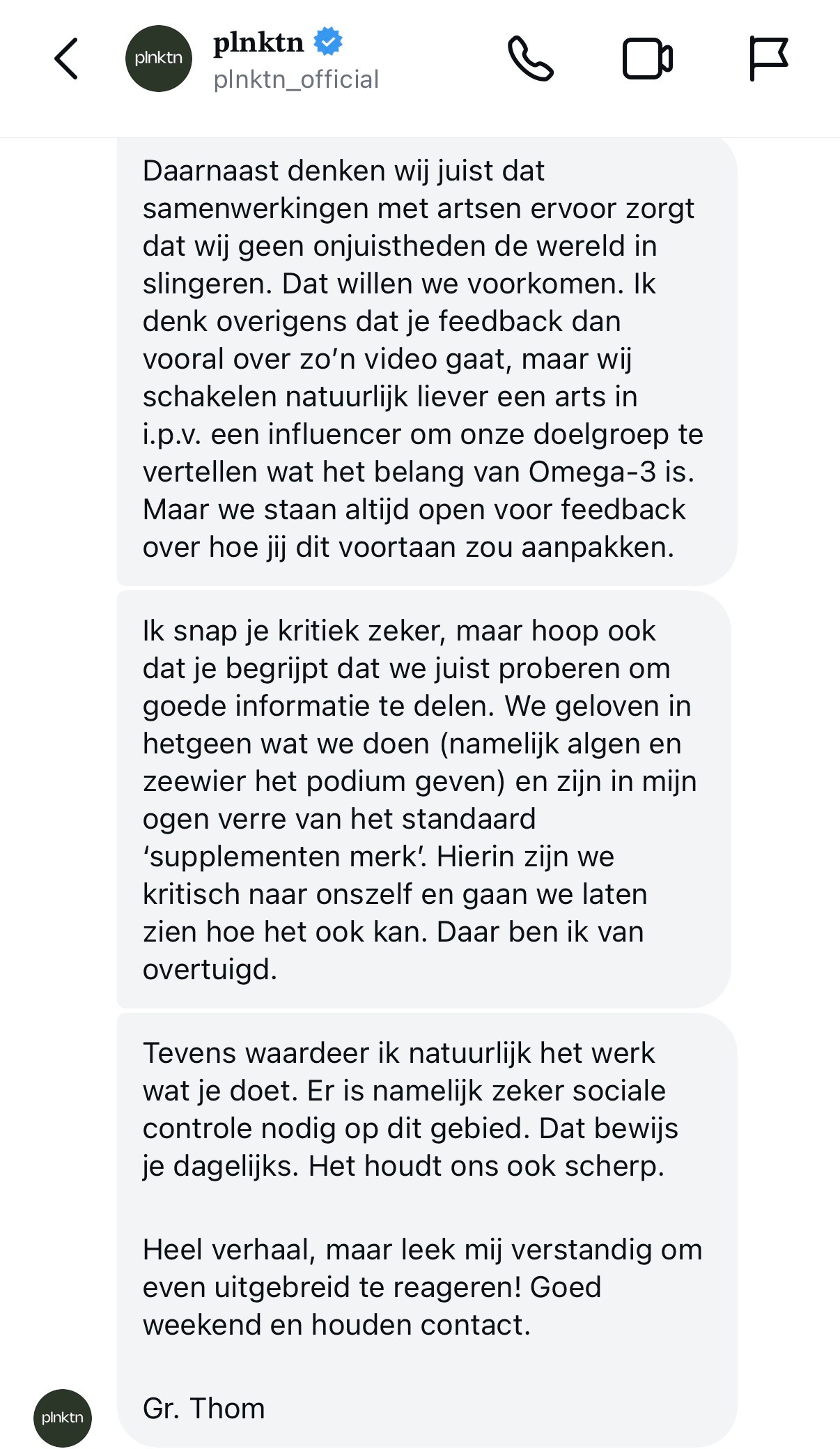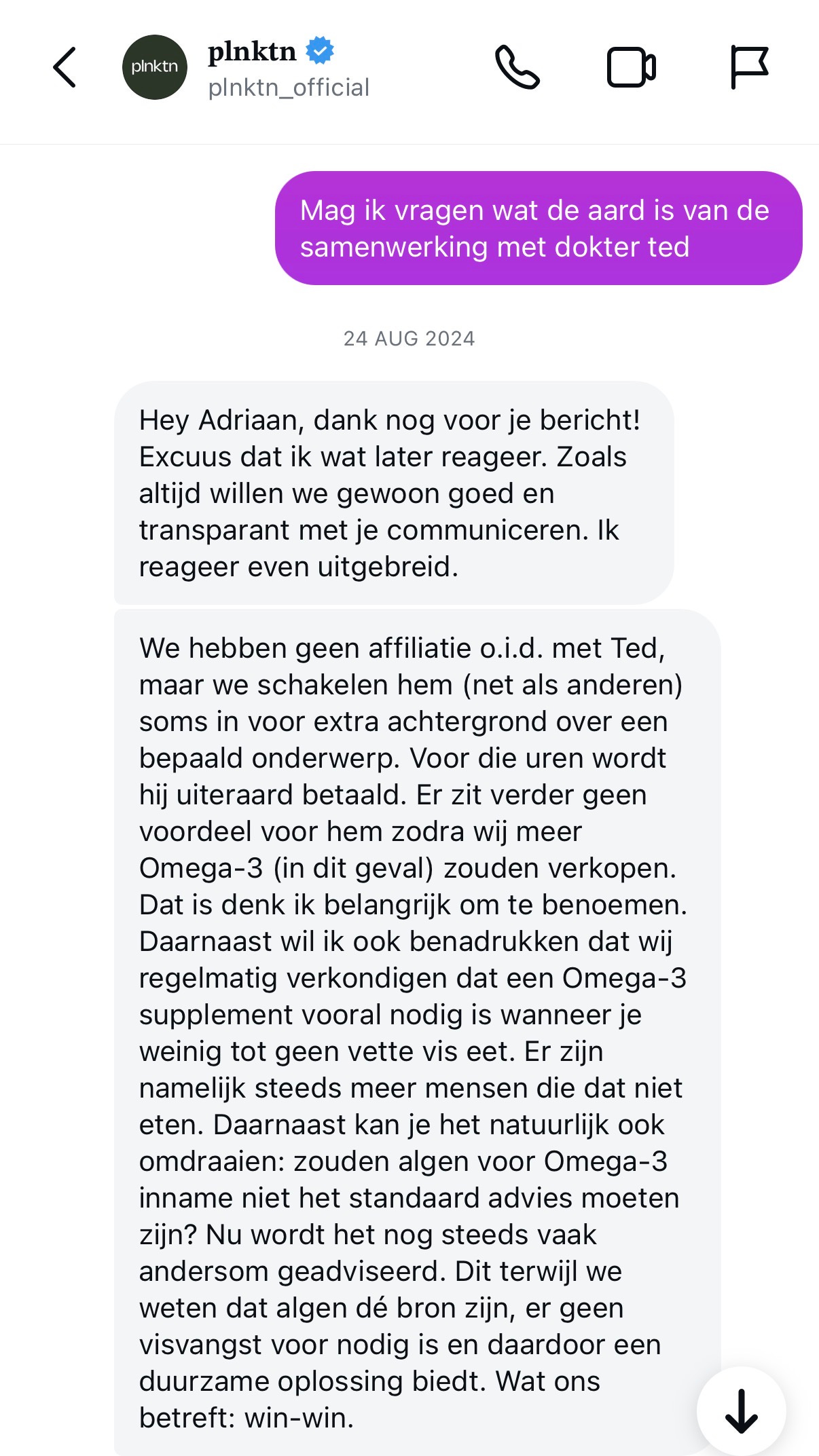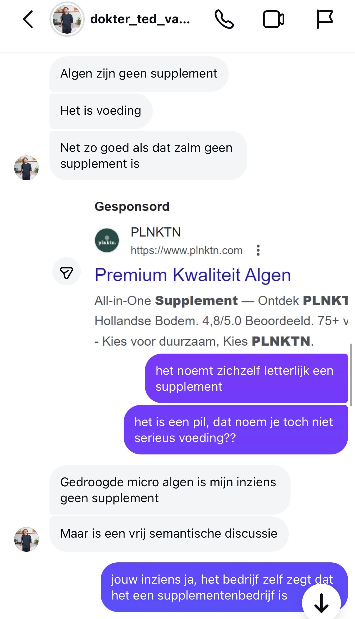 Een maand of wat later, augustus 2024, was hij te gast in een video van plnktn. Hij werd als externe expert opgevoerd in een interview, waarin hij lovend is over algensupplementen. Hij benadrukt daar de noodzaak omega 3 bij te slikken.