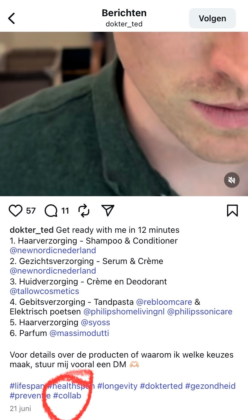 #collab is verboden in de Reclamecode Social Media & Influencer Marketing, dus hij voldoet alsnog niet