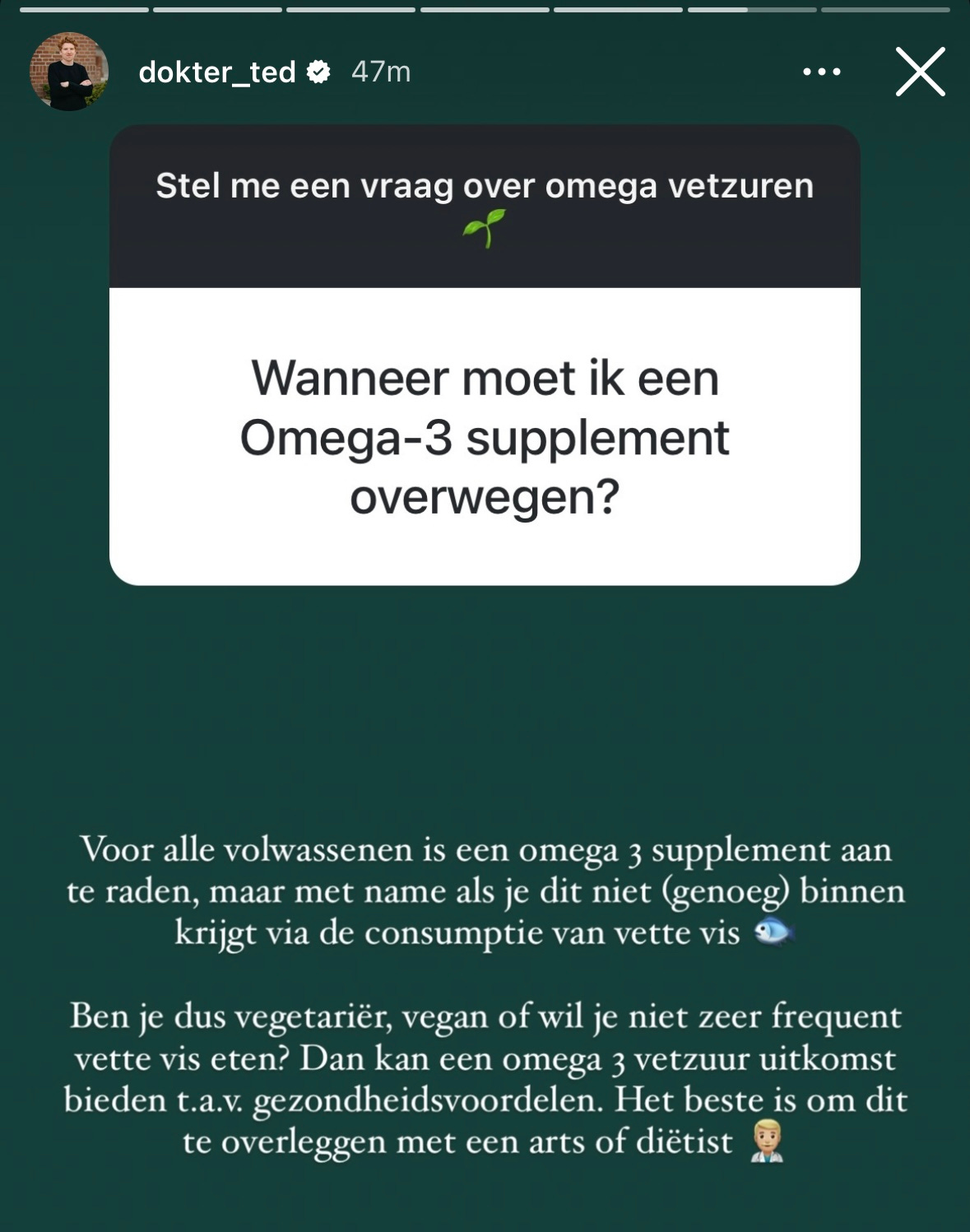 Dit kreeg op zijn eigen account vervolg met een superspontane Q&A, waarin hij zijn volgers allemaal vragen liet stellen aan hem, zogenaamd expert, over omega 3.