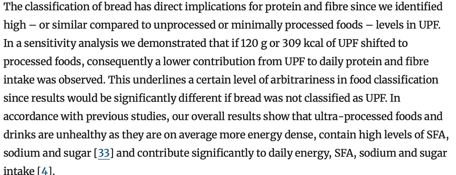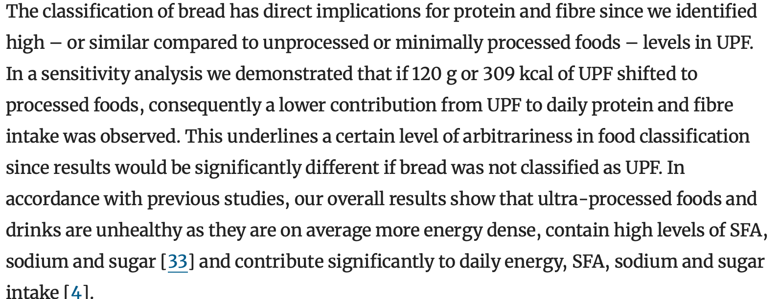 Als je dit wil vertalen naar schadelijkheid voor Nederland, denk ik dus dat de eerder genoemde 61 procent erg misleidend is. We eten namelijk veel brood en veel zuivel en zelfs de ultrabewerkte varianten hiervan zijn geassocieerd met positieve gezondheidsresultaten.