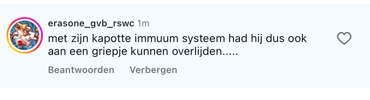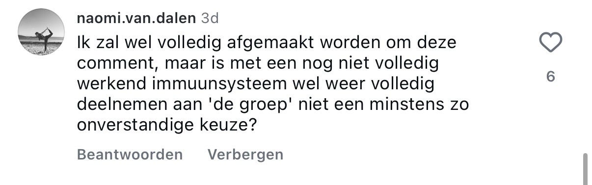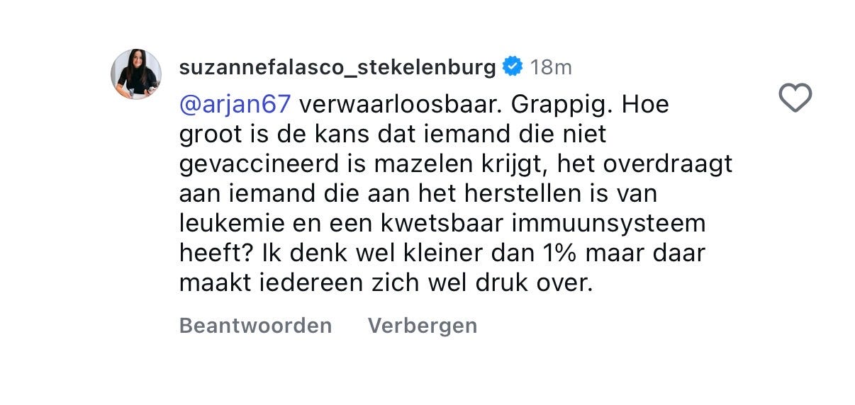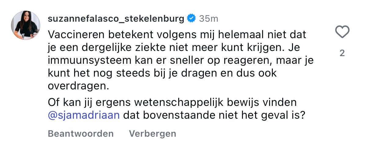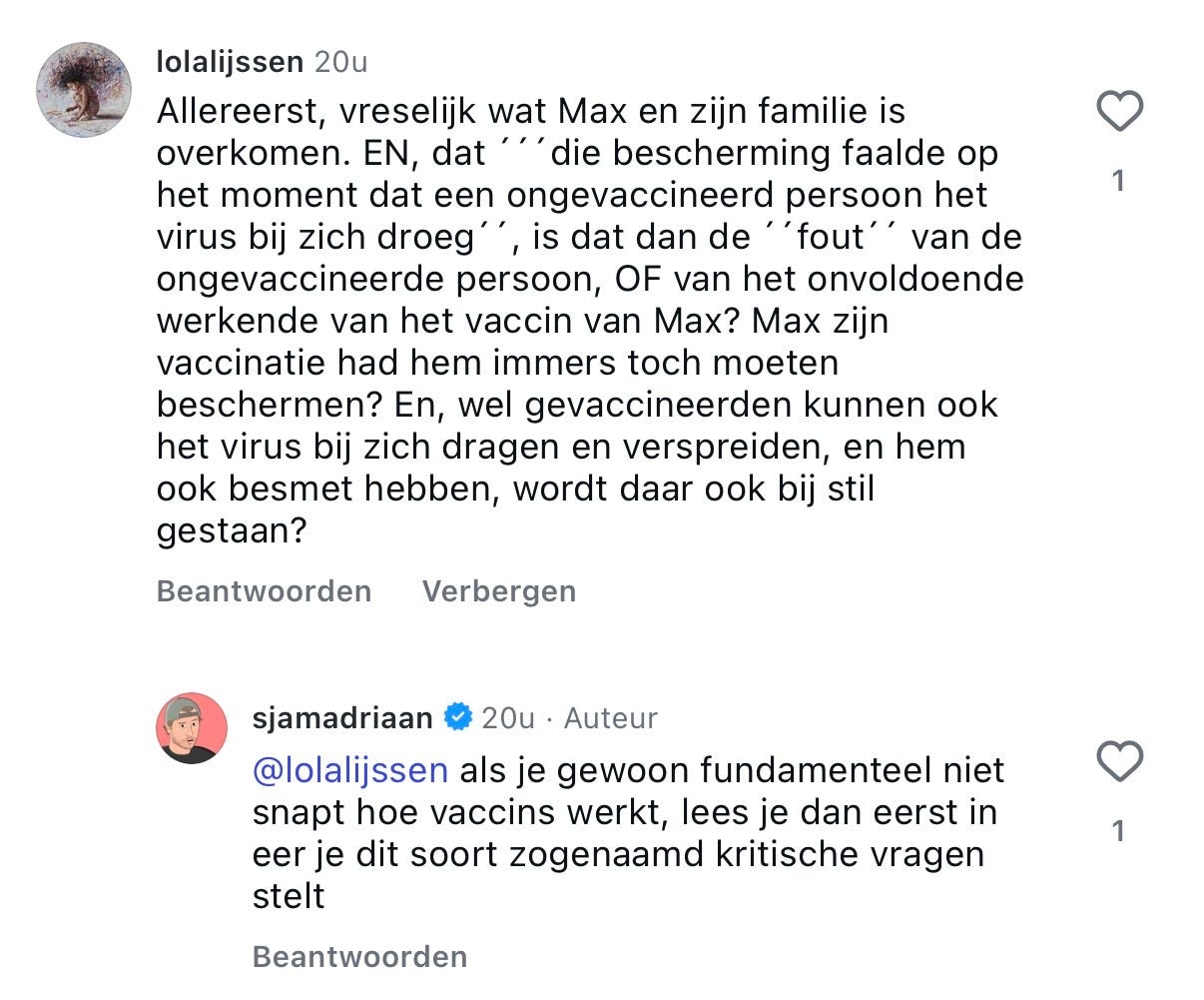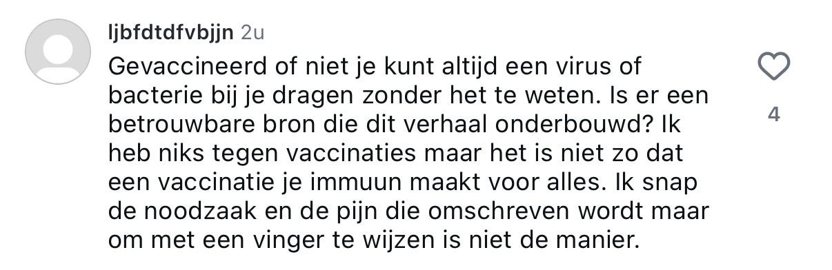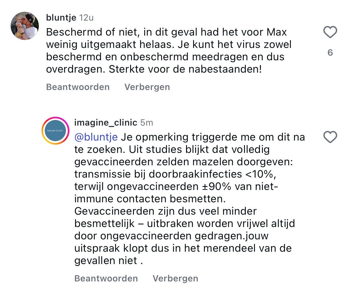 Ik heb deze met zijn toestemming ook geplaatst op Instagram en hoewel ik nog ergens de vergeefse hoop had dat het dit keer anders zou zijn, resulteerde ook dit weer in zogenaamd kritische vragen van allerlei zelfbenoemd virologen, immunologen en vaccinatiedeskundigen. Opgewarmde prakjes als “maar waarom zou ik moeten vaccineren als het vaccin jou al beschermt?” werden weer vrolijk schaamteloos geserveerd aan een lopend digitaal buffet van gecultiveerde onwetendheid. Er staan dan wel vraagtekens achter, maar het zijn natuurlijk geen vragen. Meer te kwader trouw op tafel gekwakte meningen, die vooral het totale gebrek aan kennis en kunde van de steller c.q. kwakker illustreren.