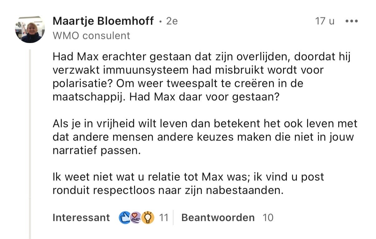 En geloof je dat niet, lees dan vooral even de reacties terug, die zijn geplaatst onder de brief van Max’ vader op zowel een post op LinkedIn als op mijn Instagram. Ik hang ze onder dit artikel. Lezen op eigen risico op een hoge bloeddruk.