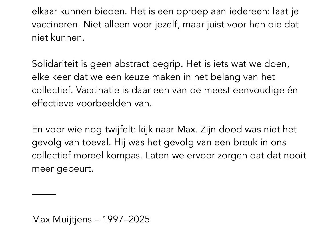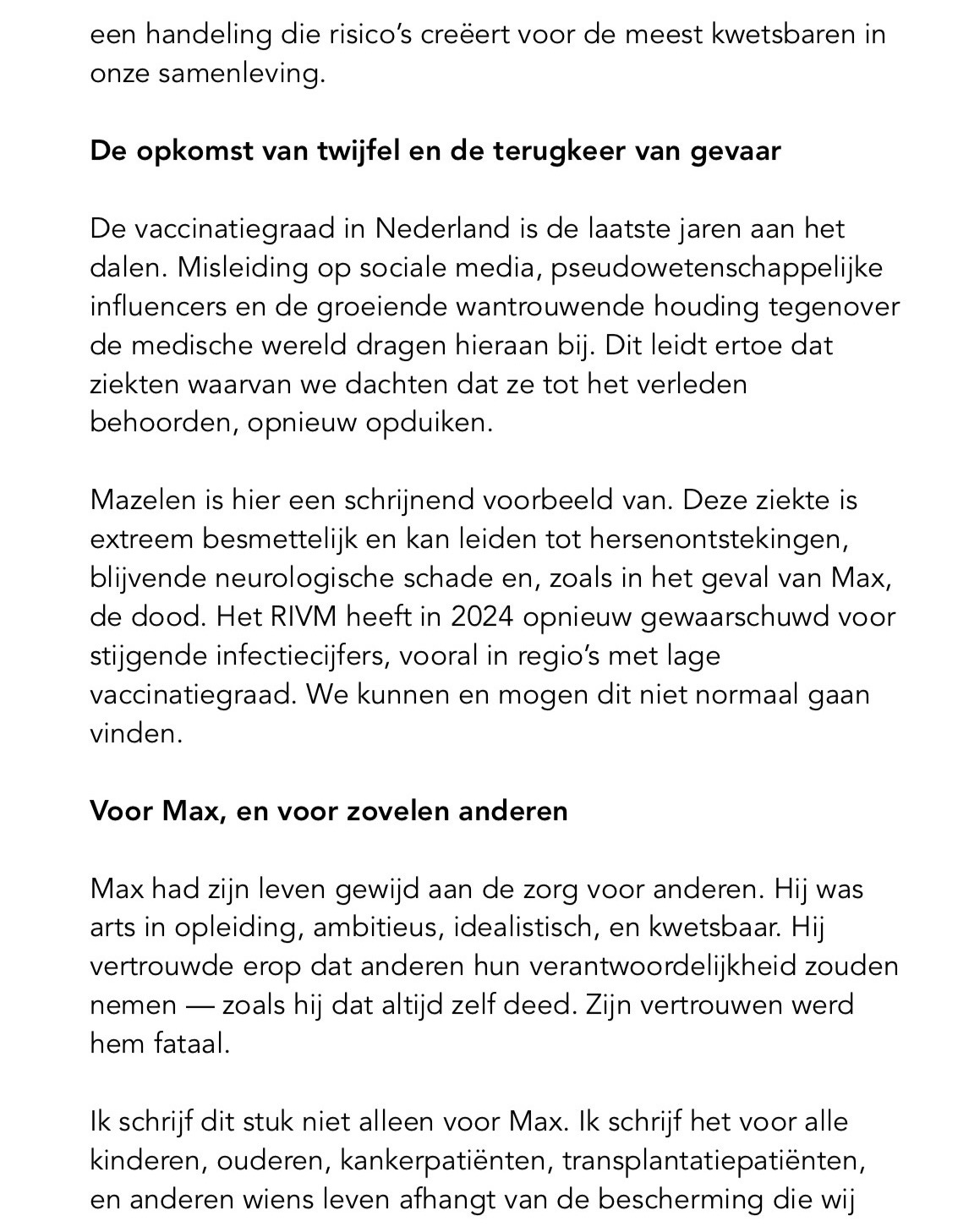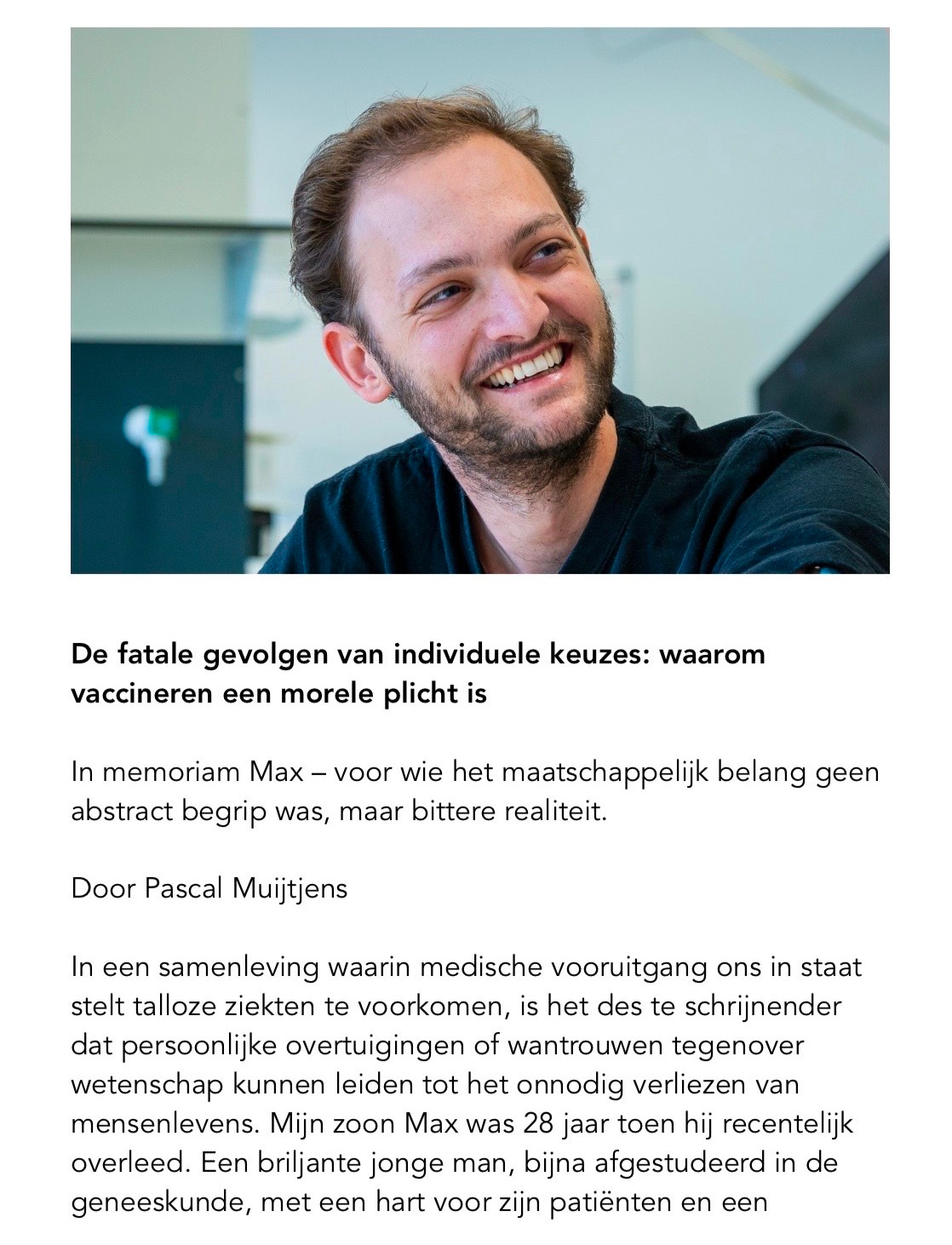 Een paar maanden geleden was het helaas weer raak. De 28-jarige Max Muijtjens werd doodziek na een infectie, vanwege een verzwakt immuunsysteem ten gevolge van een stamceltransplantatie ter behandeling van leukemie. Het werd hem fataal. Een even onnodig als hartverscheurend sterfgeval ten gevolge van een mazeleninfectie.