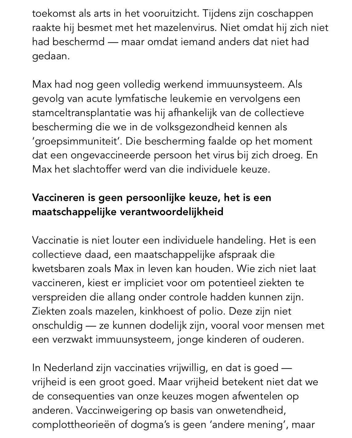 Want iedereen met een beetje verstand van vaccins, weet dat bij een adequate dekkingsgraad, de betreffende besmetting niet plaats had hoeven vinden, omdat het virus dan simpelweg de kans niet had gehad om over te springen van mens tot mens tot aan uiteindelijk Max. Dat is het mooie aan vaccineren. Niet iedereen hoeft het te doen om die nare ziektes buiten de deur te houden. Zoals in de bovenstaande brief staat: wie niet meedoet aan het vaccineren, kiest er impliciet voor om allerlei ziektes te verspreiden waar we allang van af hadden kunnen zijn.