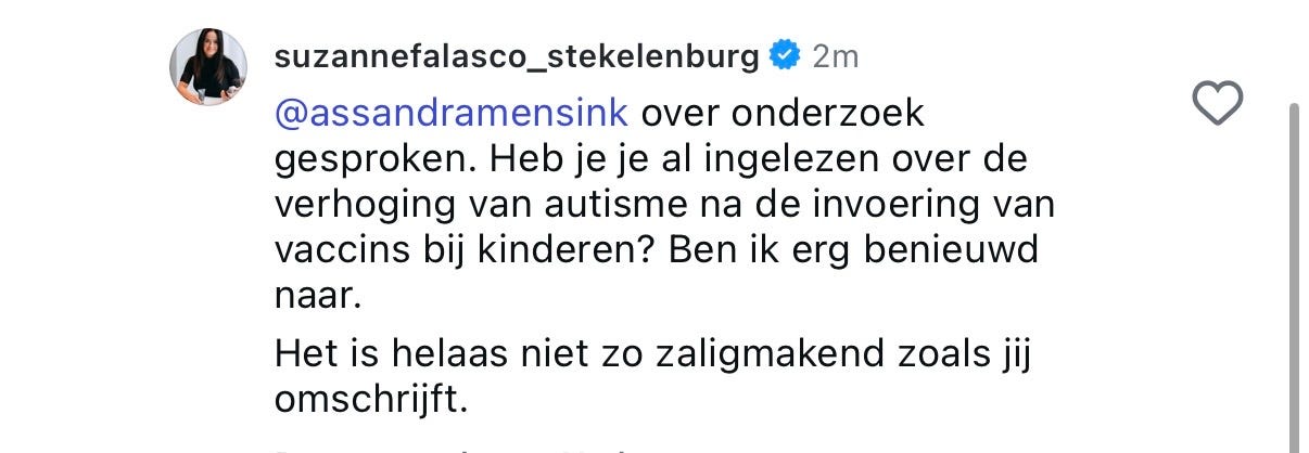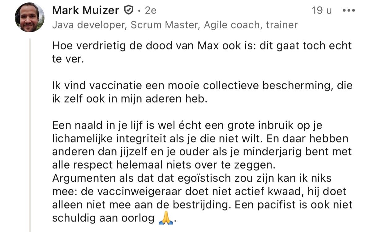 En nogmaals: dit geldt voor de militante anti-vaxxtak. Ik heb alle begrip voor mensen die enige twijfels hebben en gewoon op zoek gaan naar de juiste informatie. En wellicht daarna alsnog besluiten bijvoorbeeld zelf geen vaccin te nemen of hun kinderen niet te vaccineren. Ik blijf het maar benadrukken.
